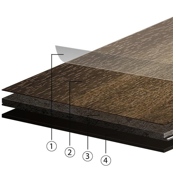 2. Decorative Layer. Combines state-of-the-art print and emboss technology for the look and feel of natural wood. In selected collections, we offer *EIR "Embossed In Register" technology that aligns the texture and printing for a more realistic wood appearance.